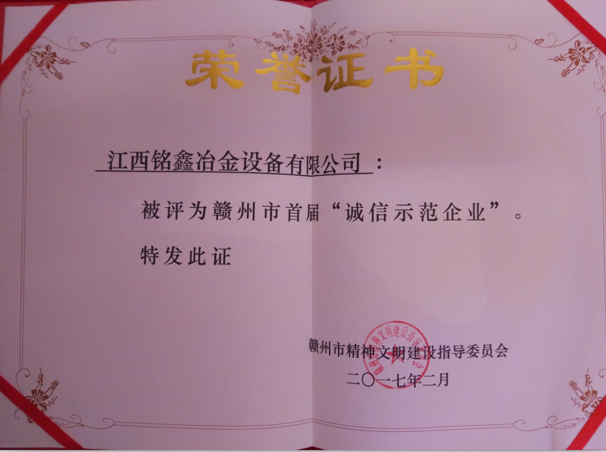 根據贛州市文明辦《關于印發<贛州首屆百家“誠信示范企業”評選活動方案>的通知》(贛市文明辦[2016]42號),經過各地各部門各單位評議推薦和評選活動組委會審核,江西銘鑫冶金設備有限公司等65家企業入圍了贛州市首屆 “誠信示范企業”。